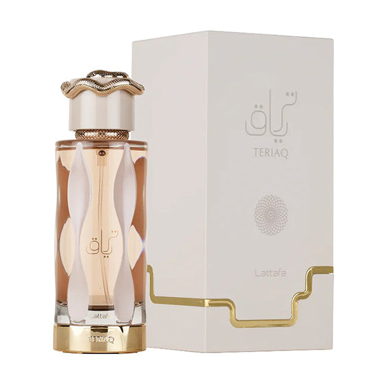 Lattafa Teriaq unfolds like an olfactory elixir, where each note weaves a tale of depth, passion, and intrigue. A luscious blend of Caramel-drenched Apricot and Spicy Pink Pepper to awaken the senses, leading to a heart of Honeyed Florals, Velvety Rose, and Rhubarb for a bold yet delicate embrace. The journey lingers into a sultry blend of smoky Vetiver, sensual Musk, Labdanum, and supple Leather to evoke a trail of enigmatic elegance.